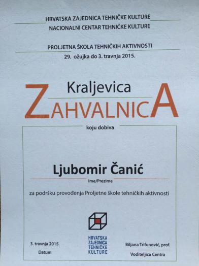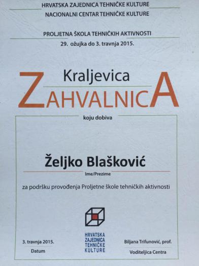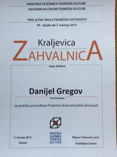 ZAHVALNICA za podršku provođenja Proljetne škole tehničkih aktivnosti. KRALJEVICA 29.ožujka do 3.travnja 2015.
